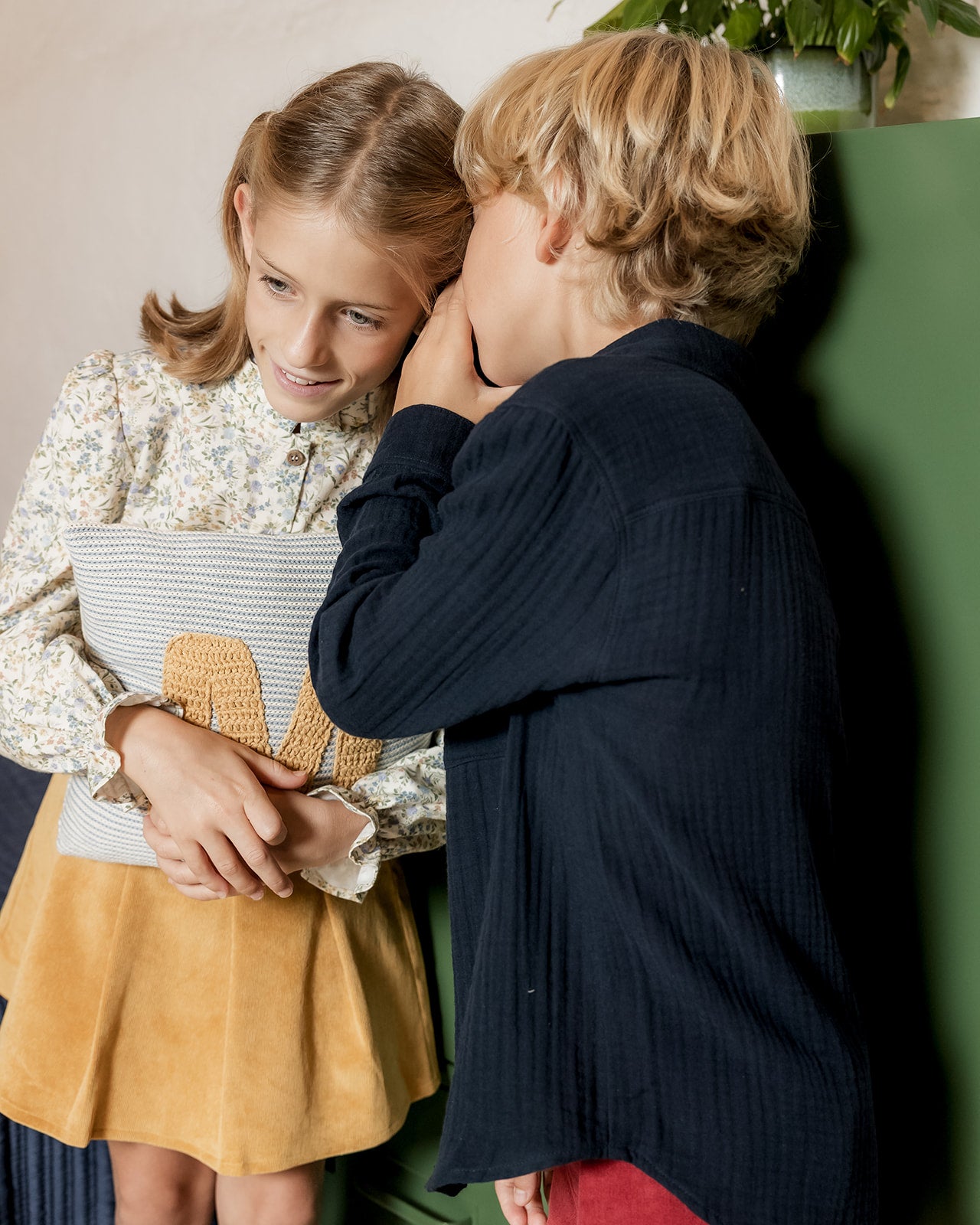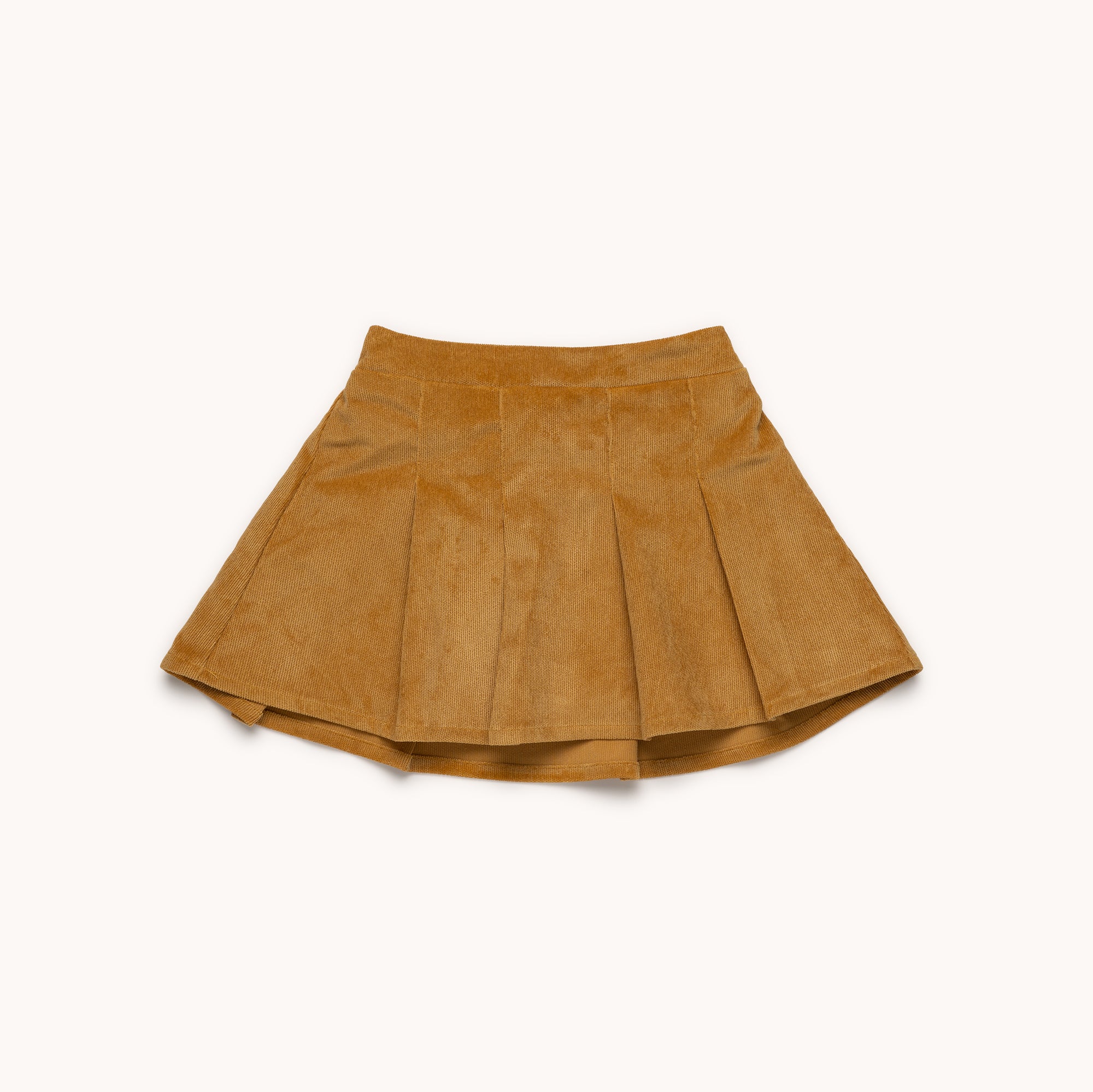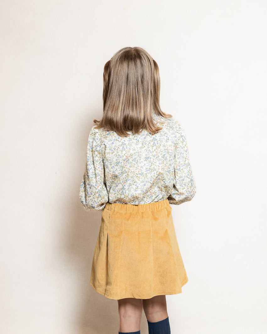 La falda de tablas en pana mostaza es única dentro de la colección. Su cintura elástica, más lisa en el delantero, estiliza y aporta un aire más elegante. Totalmente forrada y con caída estructurada gracias a las tablas, se convierte en una prenda especial para la temporada de otoño-invierno. Confeccionada en pana sintética de alta calidad, garantiza estilo y durabilidad.Disponible en tallas desde los 3 hasta los 8 años.