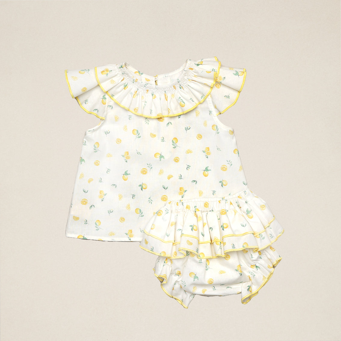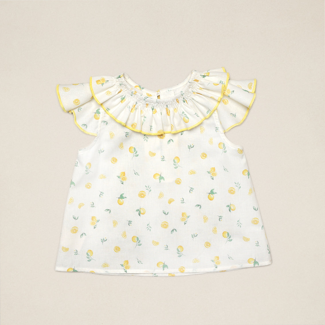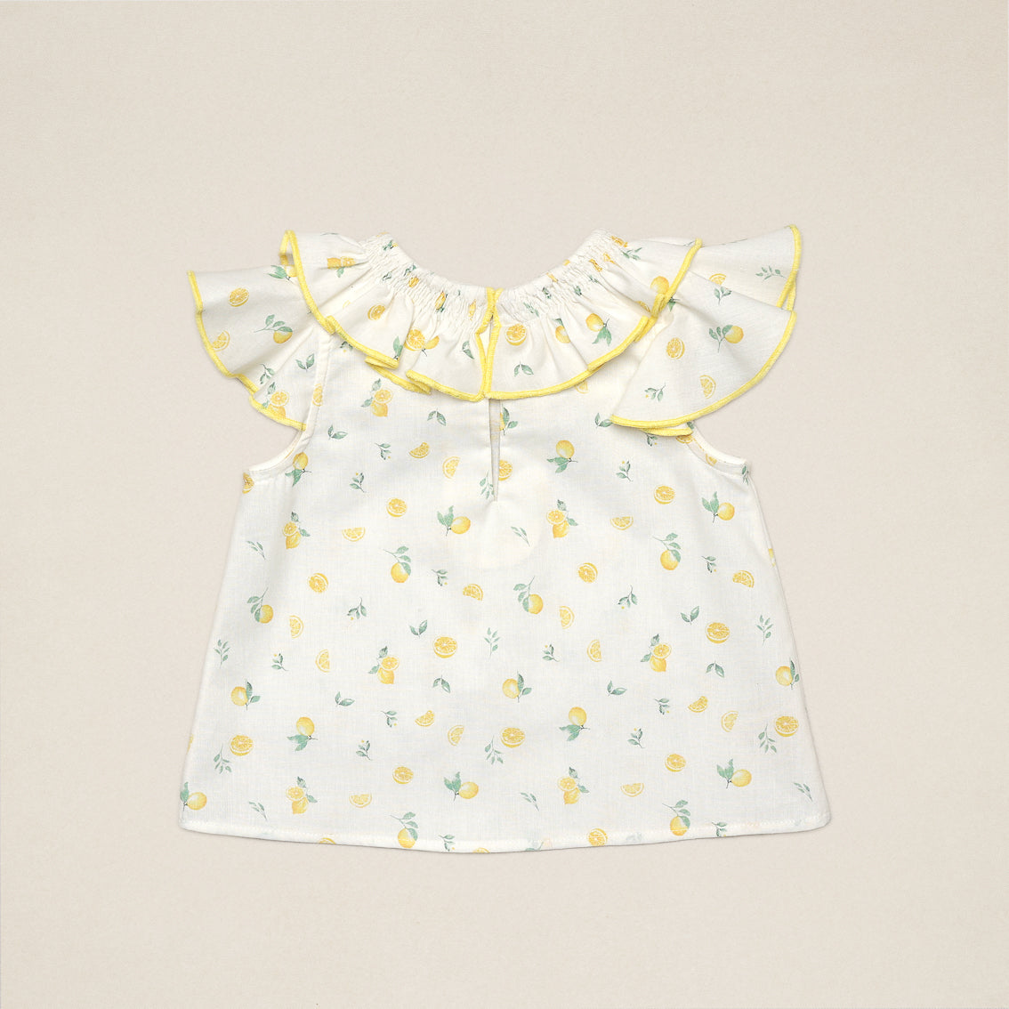 La blusa con estampado propio y cuello fruncido con frunce manual, se abrocha por detrás con un botón de algodón reciclado. Los volantes en manga y cuello, rematados con hilo a tono, crean un look refinado y original para bebés.