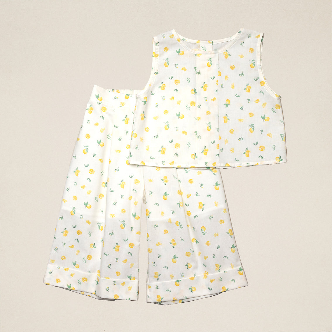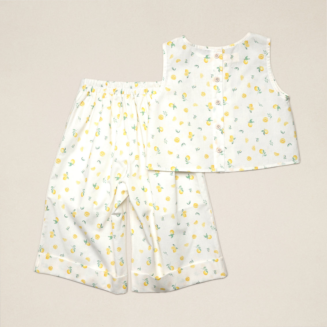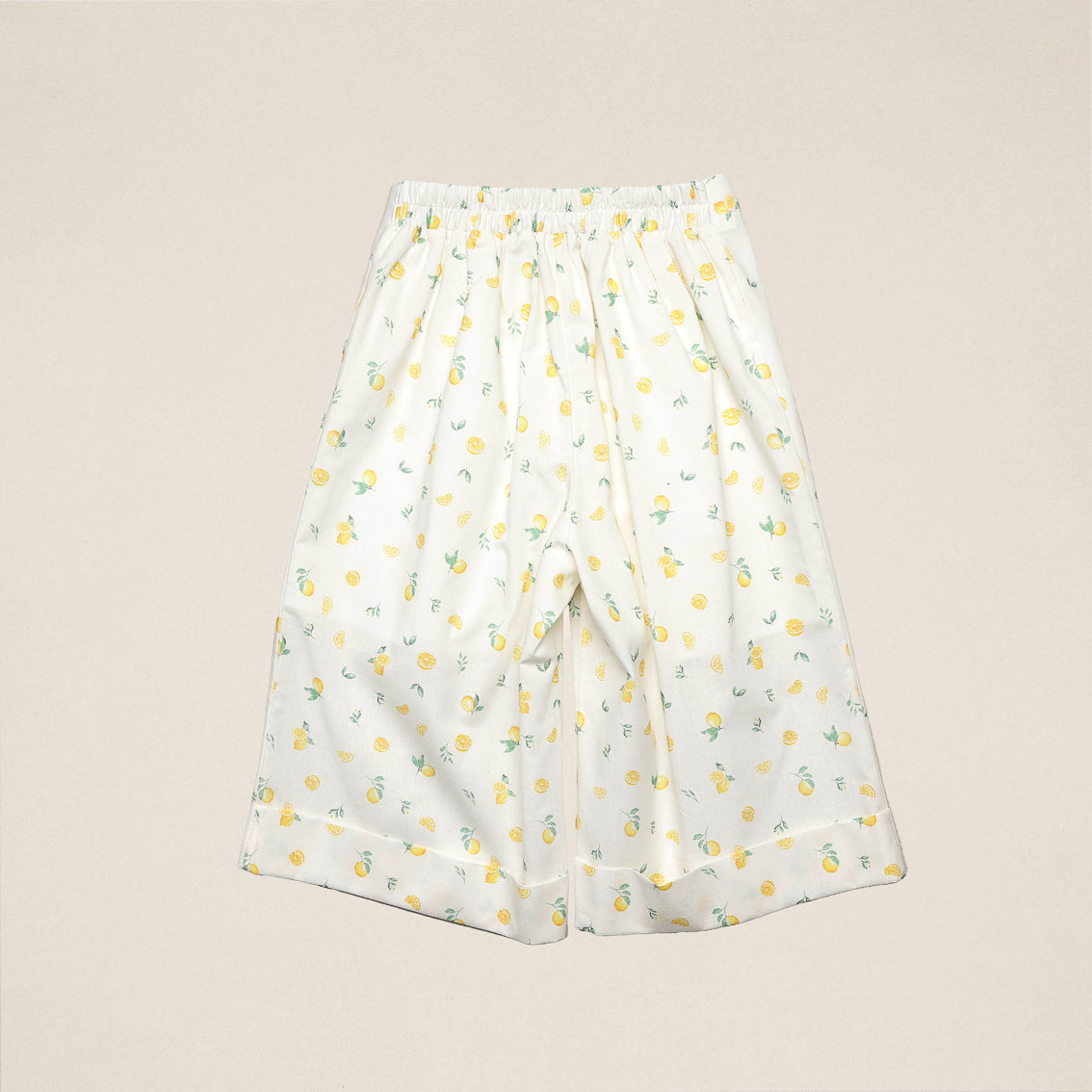El pantalón lemonade, luce un encantador estampado de limones con estilo tobillo o pirata, presenta una vuelta forrada en la parte superior y pinzas en la parte delantera. su cintura con goma lisa garantiza un ajuste cómodo, sin marcar, favoreciendo el movimiento natural de la niña.