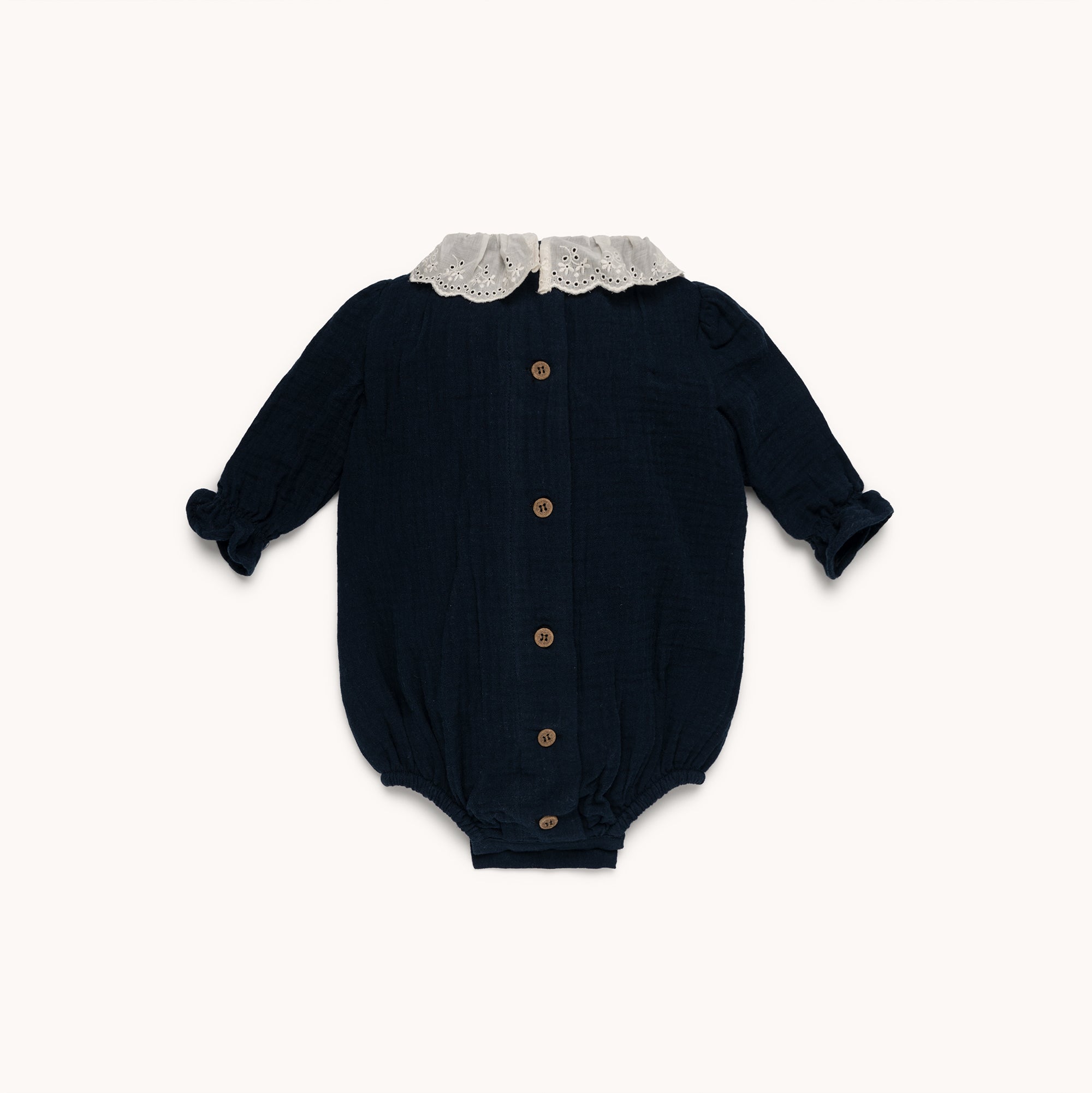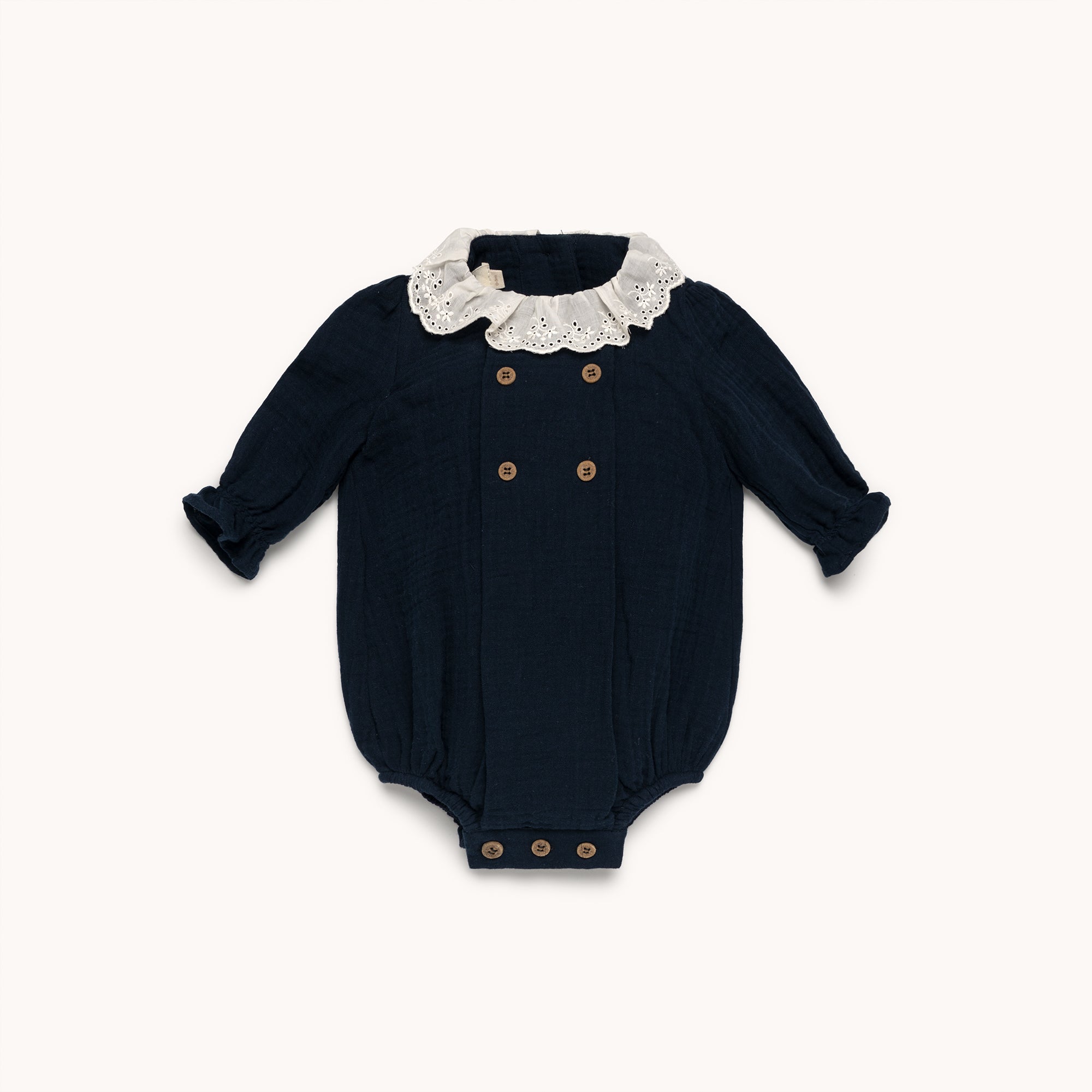 El pelele de bámbula azul con cuello de puntilla es una prenda delicada y elegante, confeccionada con el máximo cuidado para vestir a tu bebé con estilo y comodidad. Su cuello volante adornado con puntilla de alta calidad de origen japonés le aporta un detalle único y sofisticado, convirtiéndolo en una pieza especial dentro de la colección.Pensado para el confort diario, incorpora abotonadura completa en la espalda y tres botones de algodón reciclado en la parte inferior, que facilitan el cambio de pañal. El forro interior garantiza suavidad y protección para la piel más sensible, mientras que los botones en tono marrón, también de algodón reciclado, refuerzan el compromiso sostenible de la prenda.Confeccionado en tejido de bámbula azul, ligero, transpirable y respetuoso con la piel, este pelele es ideal para la temporada de otoño-invierno.