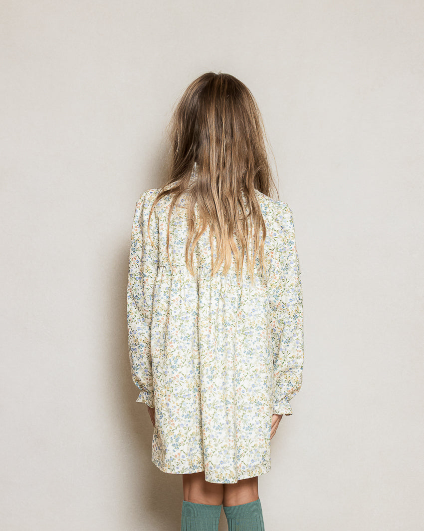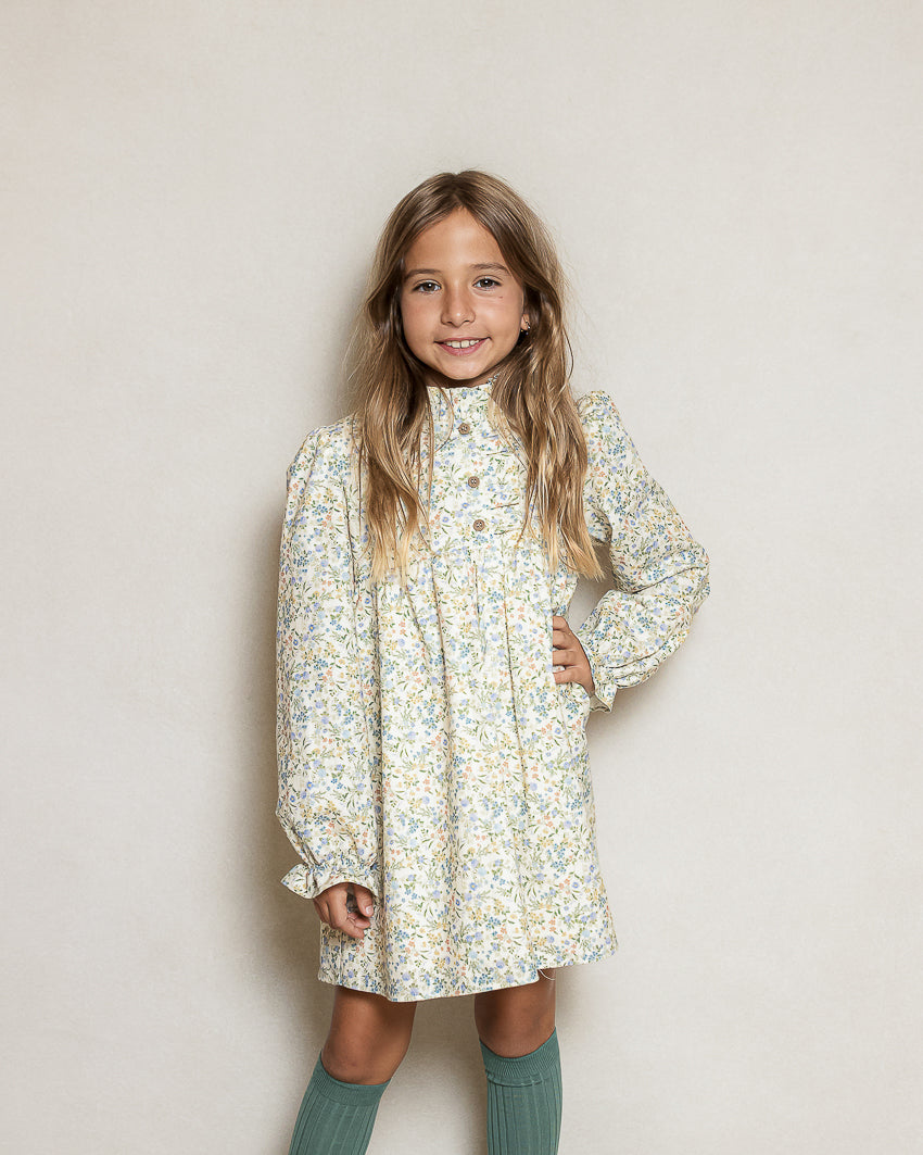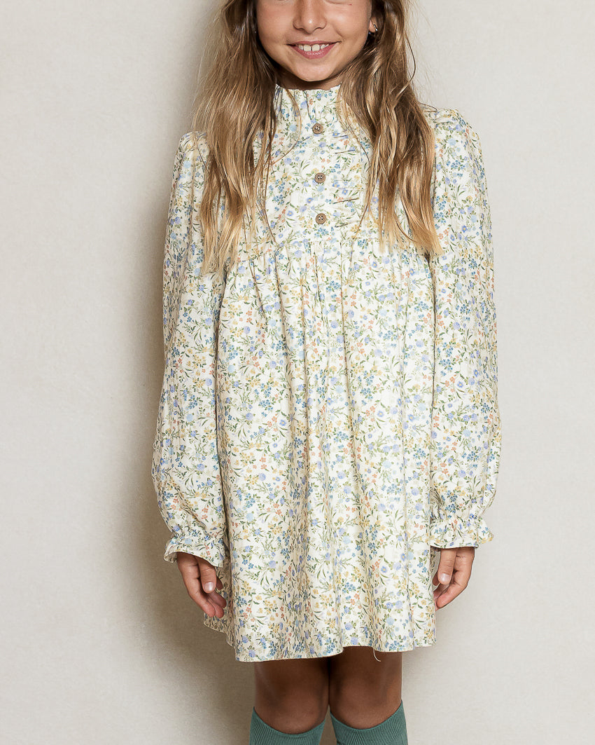 El vestido Florin para niña es delicado y romántico. Con cuello chimenea, corte alto y pliegues que caen desde el cuello, ofrece movimiento y elegancia. Incluye botones de algodón reciclado en la parte delantera y puños con goma para mayor comodidad. Confeccionado en algodón orgánico con estampado floral sobre fondo crudo, es ideal para la temporada de otoño-invierno.El vestido Florin para niña es delicado y romántico. Con cuello chimenea, corte alto y pliegues que caen desde el cuello, ofrece movimiento y elegancia. Incluye botones de algodón reciclado en la parte delantera y puños con goma para mayor comodidad. Confeccionado en algodón orgánico con estampado floral sobre fondo crudo, es ideal para la temporada de otoño-invierno.