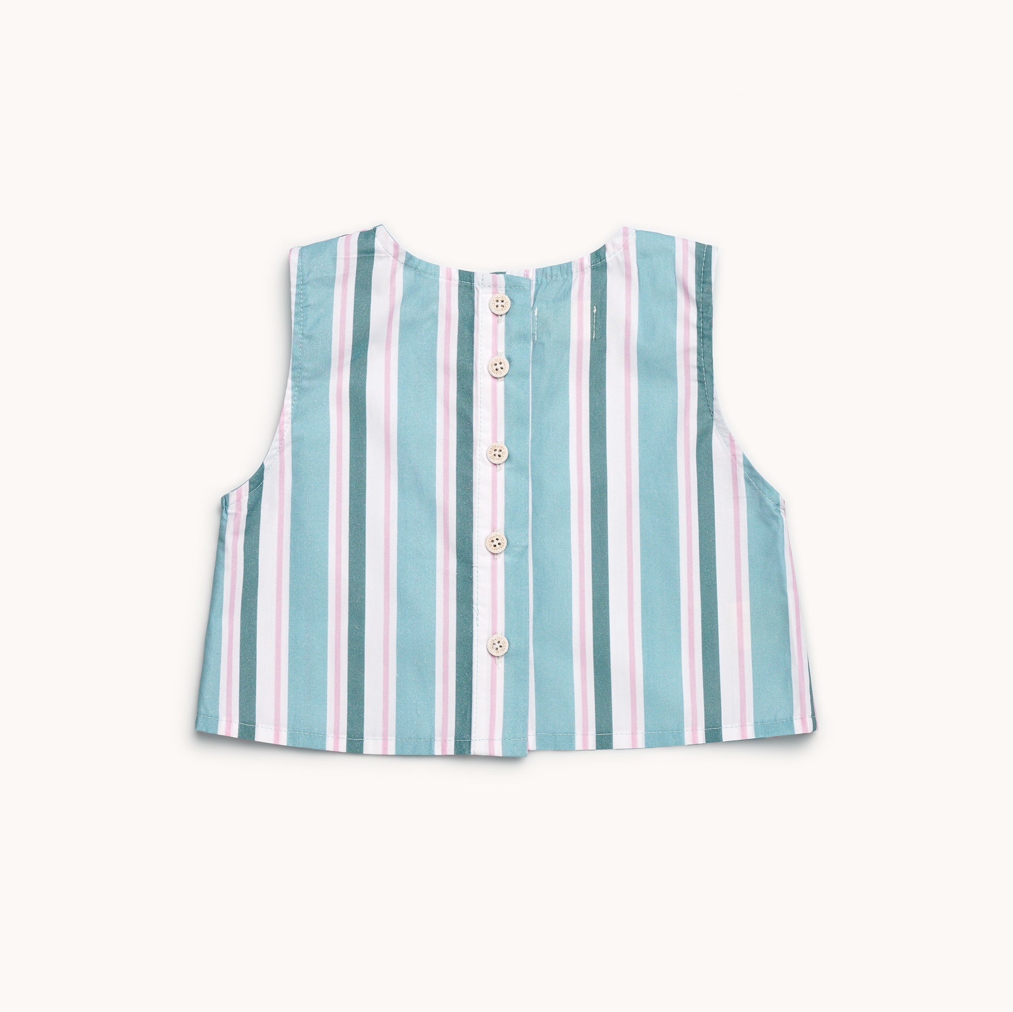 BLUSA NIÑA RIVIERA es una blusa de niña de algodón de rayas de MI MATS KIDS para primavera-verano 2026: ligera, cómoda y con un acabado cuidado. Pertenece a la cápsula Riviera, con un punto mediterráneo: rayas suaves y florales tipo liberty. En turquesa y rayas delicadas. Un básico de temporada con detalles especiales, perfecto para looks coordinados.